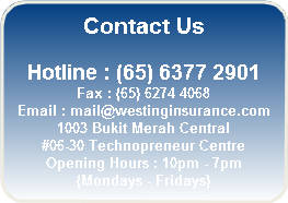 Westing has its origins from Singapore has been providing insurance solutions and services since 1992. In 2010, Westing decided to expand its business and incorporate the company as ‘Pte Ltd’ . Westing Agency has wealth of experiences in meeting customer needs and its business has been growing by more than double digit year on year for the past 15 years! Westing Agency – a company you can TRUST!